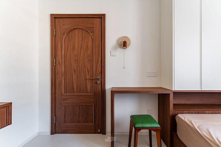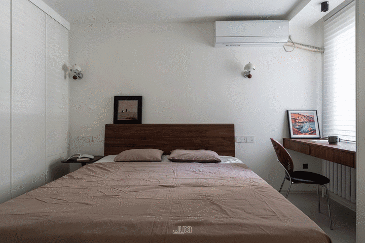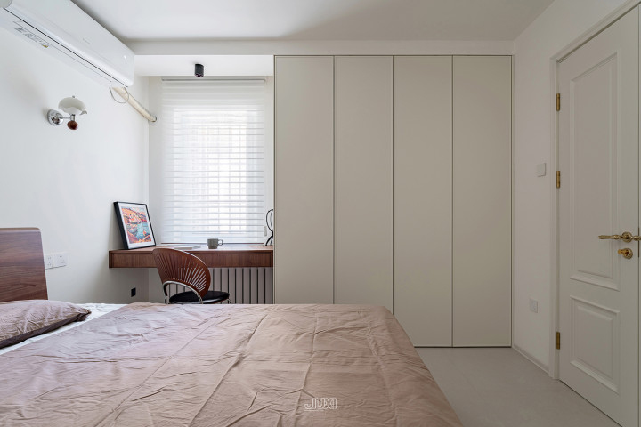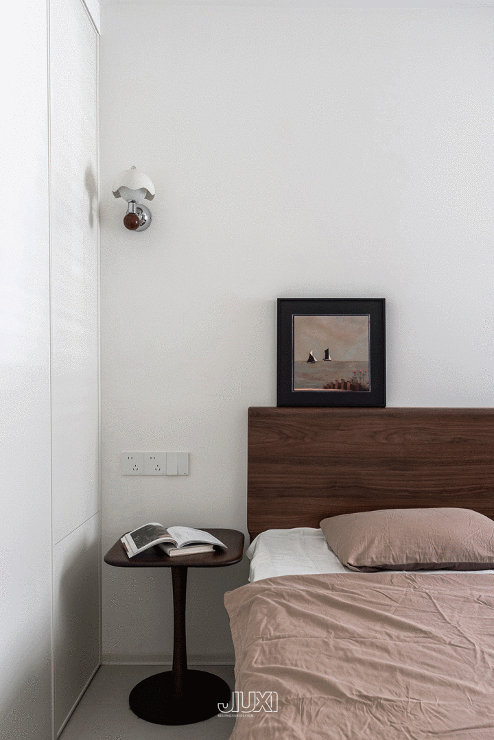 床头左侧用边几替代床头柜,上方壁灯散落温情清明。右侧用窗台蔓延出悬浮桌,兼顾置物、梳妆、临时办公。
