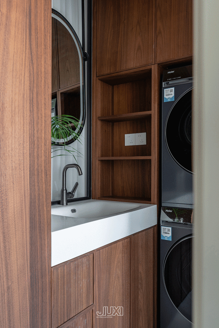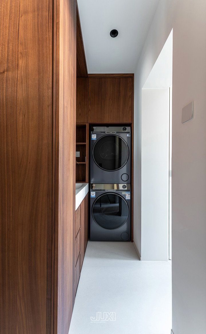 洗手柜的转角处把洗衣烘干机叠放进柜体里,打造家政区。沉进时将脏一稔丢进去,出来径直变干净。