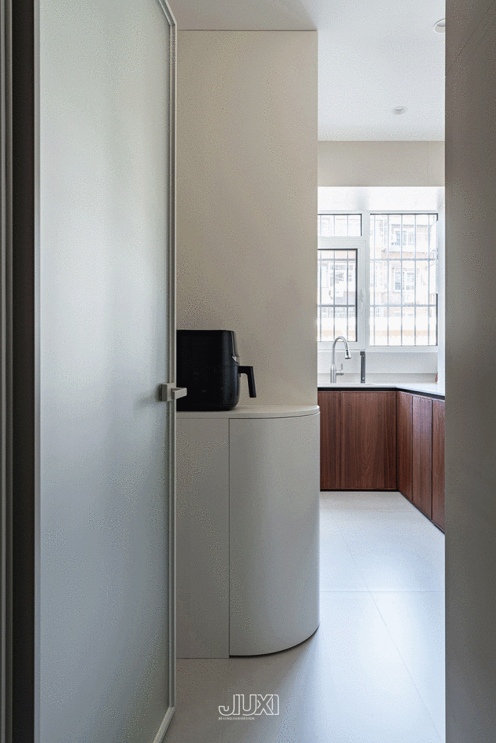 厨房进门处作念了一个弧形的柜子,让动线愈加通顺,还能裁汰进口的拥挤感。台面还可以放弃电饭煲或空气炸锅,缓解空间压力。
