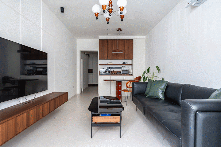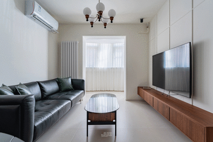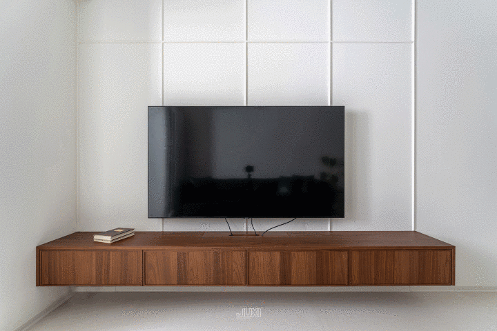 纯白墙面+胡桃木电视柜,当然的温润感径直暖到心窝里。柜体禁受悬浮式计划,增强灵动性的同期,也更便于日常的清洁打扫。