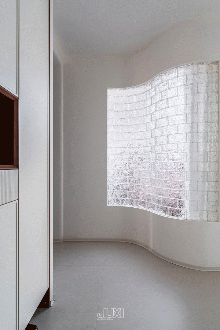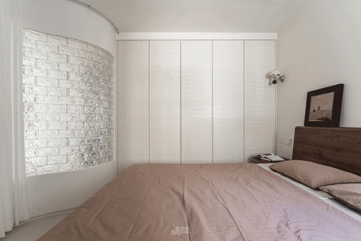 卧室里砌筑一面弧形的水晶墙 ,玻璃砖像半透明方糖块,让总共这个词房间像加了一层柔光滤镜,短暂变得亮堂高等。