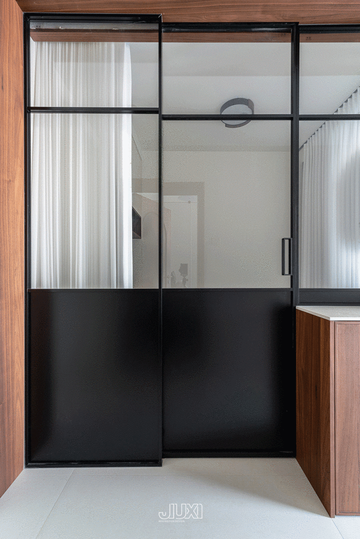书斋摄取推拉门, 一半超白玻璃一半是磨砂黑门板 ,搭配里面的轨谈帘,秘密透光两不迟误!隐形轨谈,开合顺滑无声响。