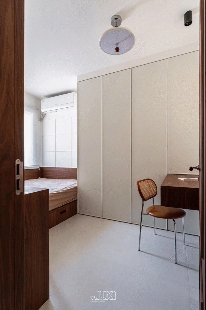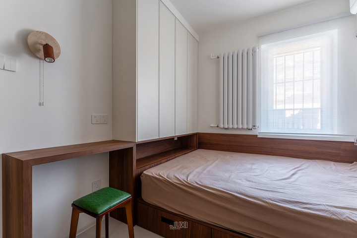 次卧将书桌、衣柜、地台床连成一条线 ,地台床与书桌禁受磋议的原木色材质 ,视觉上更显合座。上方的淡色衣柜,也为空间加多档次。