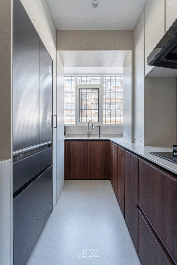 厨房U型布局,水槽靠窗、切菜台连灶台,转个身就完成洗→切→炒 。 双开门雪柜径直嵌进柜内,严丝合缝不凸不挤,不俗的收纳空间自在囤货需求。