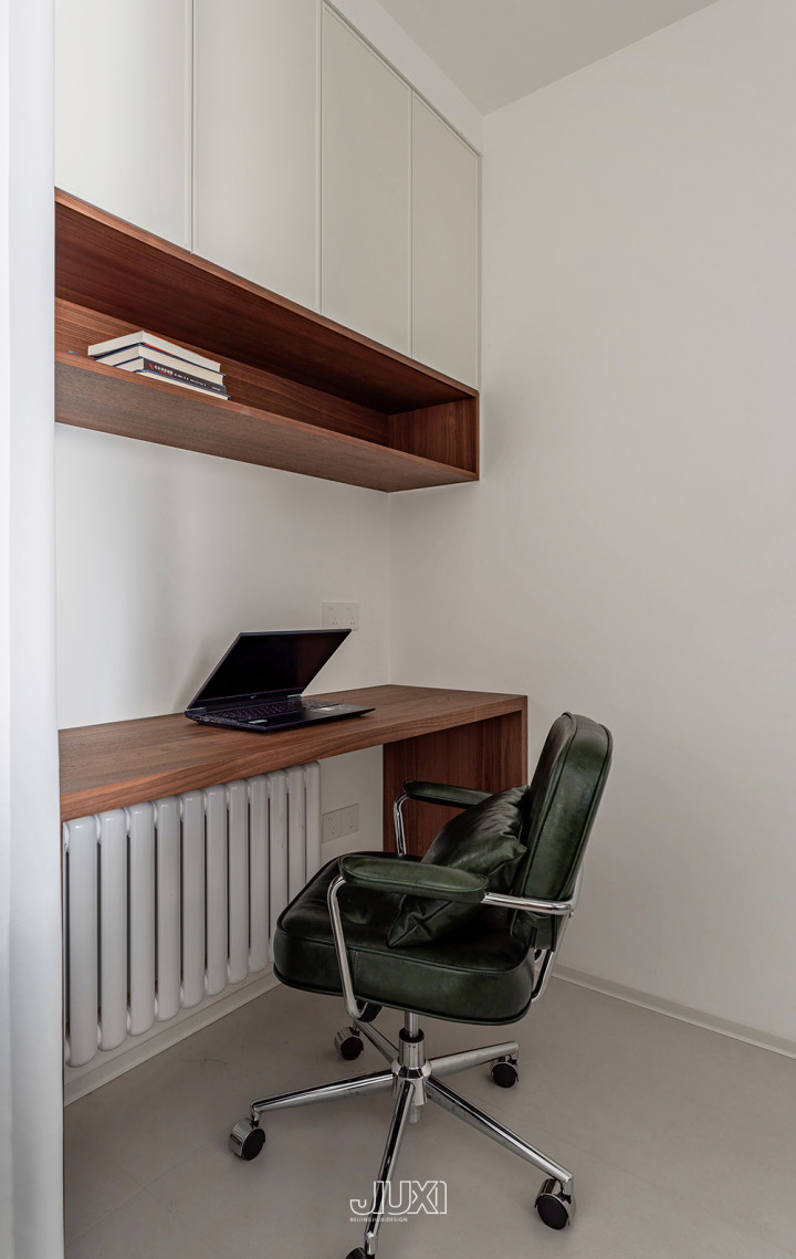 胡桃木书桌配深色皮椅,打造办公区只需一角。头顶预留书架存放书本和文献, 贵寓伸手就或者着,干活效爽径直拉满。