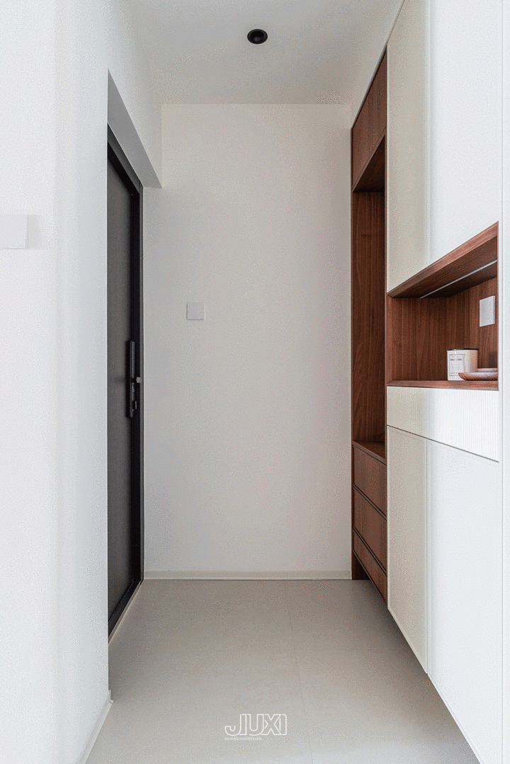 玄关靠墙定制一溜储物柜,白+木纹拼色,清亮不压抑 。 底部悬空15cm ,各式家居鞋一脚踢进去,整皆不杂沓。