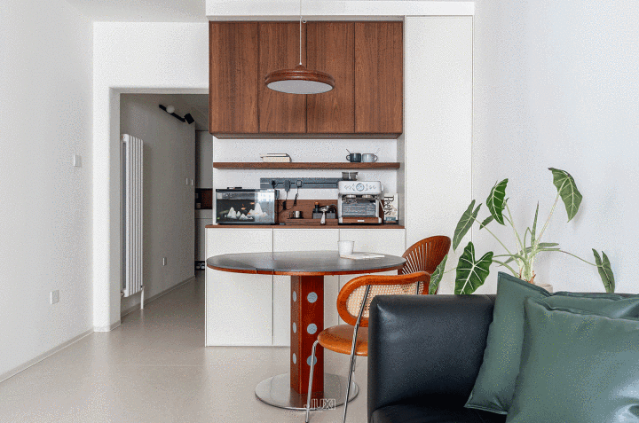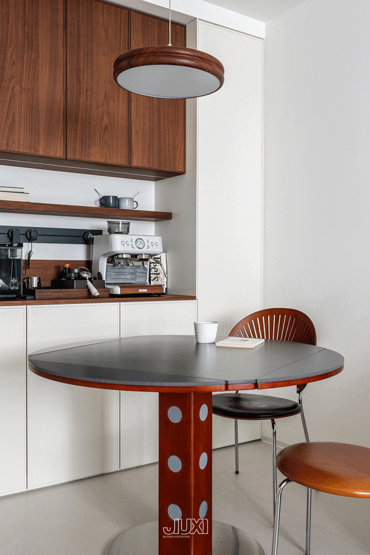 圆形的折叠餐桌搭配镶嵌式餐边柜,既可以自在多东谈主用餐,又不会占用过多空间。