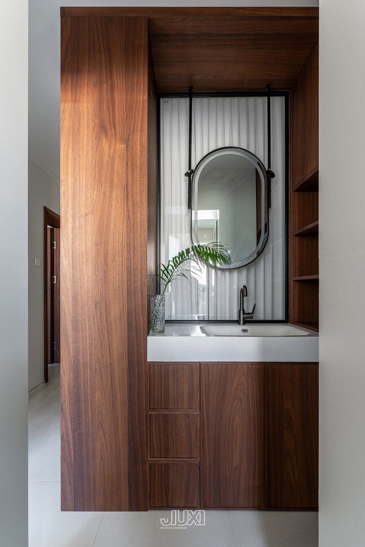 洗漱区外移作念干湿分离,台盆被柜子裹得严严密实 ,水管杂物全藏进柜肚里,清亮又整洁。